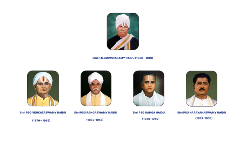 The origin of the family could be traced way back to its forebearer, Sri Venkatarama Naidu who belonged to the family of ‘Periya Veedu‘ (The Big House). One of his sons was Sri Sama Naidu. PSG Family is the direct descendent of Sri Sama Naidu. The letter ‘P’ in the name ‘PSG’ signifies the name of the house and the ‘S’ stands for Sri Sama Naidu. Sri P S Govindasamy Naidu was one of the sons of Sri Sama Naidu and hence the third letter in the name ‘PSG’ signifies him. The founders propelled several charity expeditions through generations and have hence immortalized the name “PSG”.