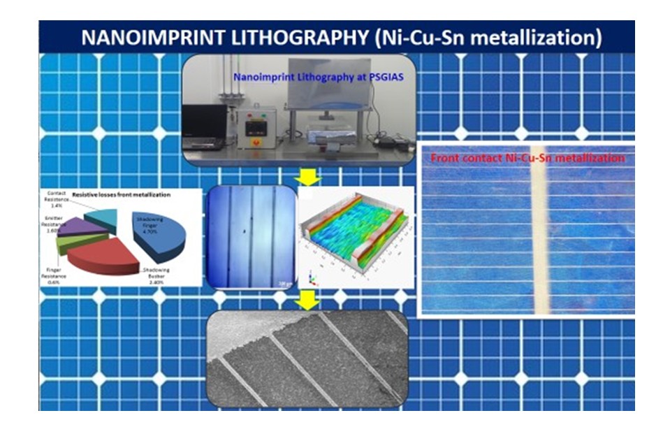 Screen printing dominates solar cell metallization due to high throughput but faces challenges from high silver usage, shadow loss, and interruptions in narrow finger lines. At PSGIAS, we developed cost-effective, silver-free fine-line front contact metallization using nanoimprint lithography (NIL) and maskless lithography. An in-house NIL tool was built for integration with crystalline silicon solar cell fabrication. Finite Element Analysis (FEA) guided optimized grid designs, enabling ~1% efficiency improvement by reducing shading loss. Replacing silver with Ni/Cu/Sn metallization offers similar conductivity at lower cost. This approach enables scalable fabrication of fine-line (<20 μm) grids, significantly reducing solar cell manufacturing costs.