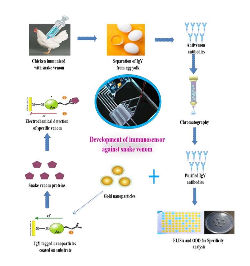 Our group focus on development of nanobased highly sensitive electrochemical and calorimetric kits for various medically related ions like sodium, potassium, magnesium and calcium. We have been successful in integrating IgY antibody to gold nanoparticles for calorimetric detection of big four snake venoms in India like cobra, krait, Russel viper, saw scaled viper. We are using SERS based detection platform detection of bacterial toxins in water and food.