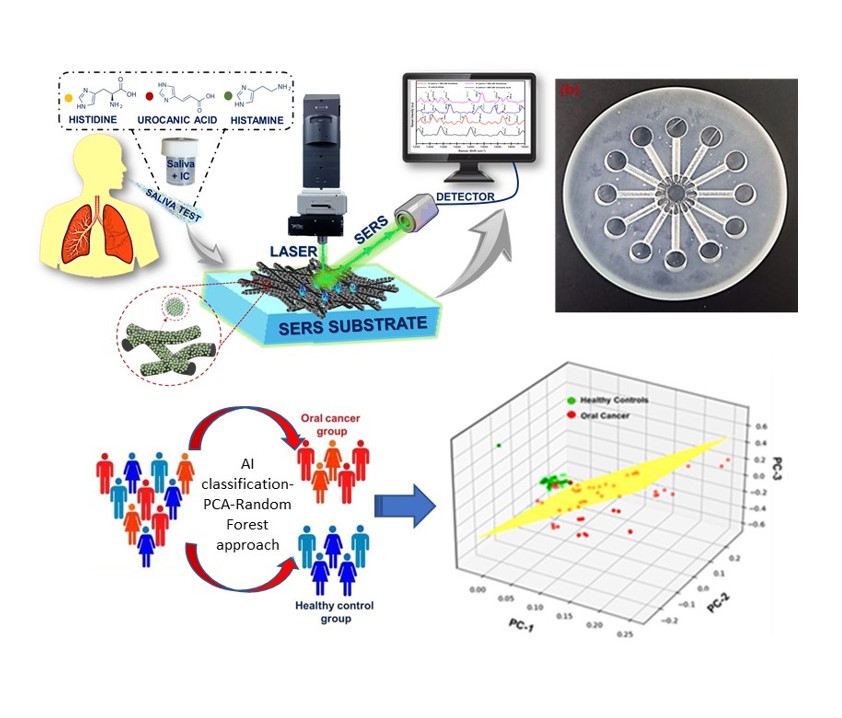 Our research presents a novel Surface-Enhanced Raman Scattering (SERS) biosensor integrated within a 3D-printed microfluidic platform for the detection of salivary biomarkers associated with oral and lung cancers. The sensing interface is engineered using plasmonic nanostructures anchored on carbon nanofibers, which provide high surface area, enhanced charge transfer, and strong electromagnetic field localization for ultrasensitive biomolecular detection. The microfluidic system enables precise sample handling and rapid analysis, while the integration of AI-assisted data processing ensures robust pattern recognition and predictive diagnostics. This synergy of additive manufacturing, nanoplasmonics, and AI-enabled analytics establishes a scalable, non-invasive, and cost-effective diagnostic platform, potentially suitable for pre-diagnosis and mass screening.