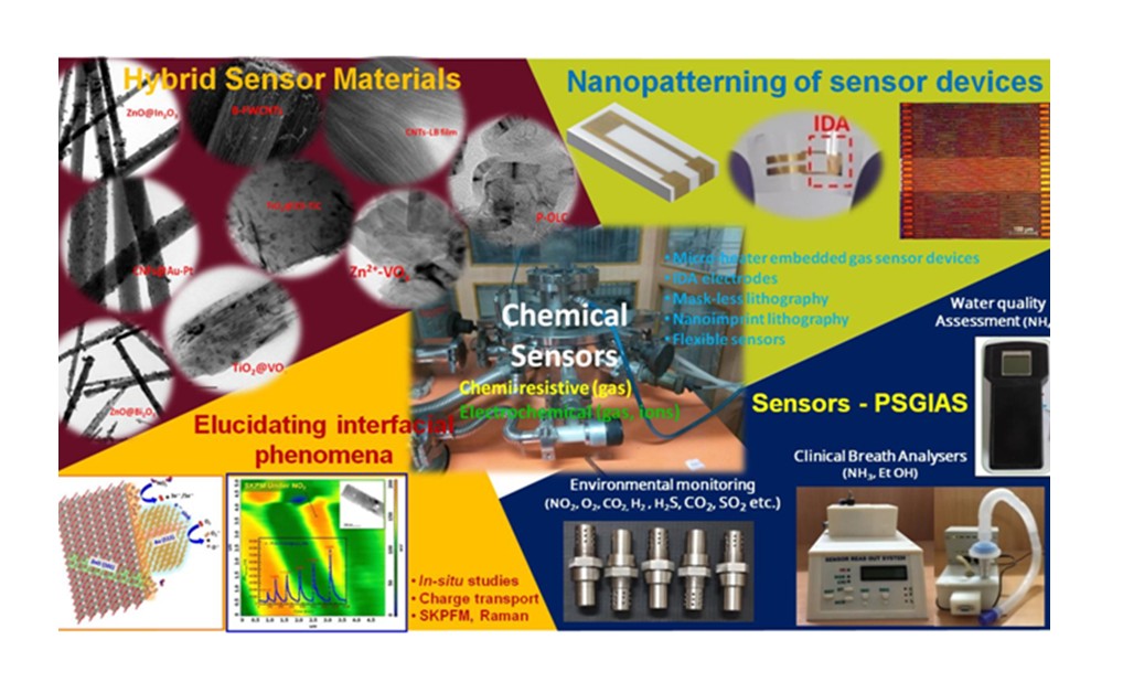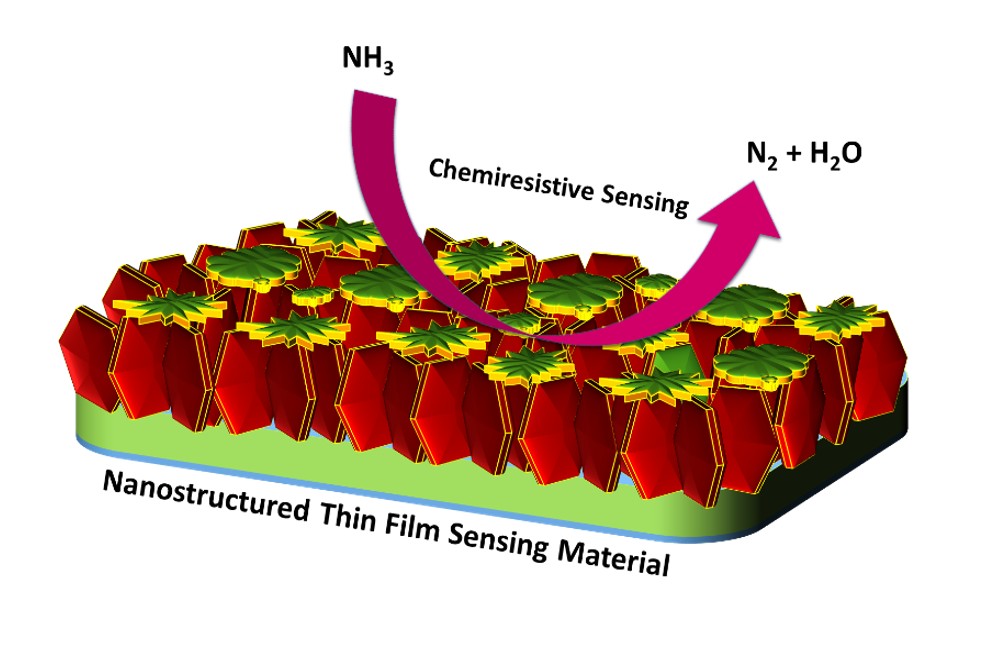 Our research focuses on developing sustainable gas sensors for environmental monitoring and biomedical applications. We design nanoscale heterojunction materials based on metal oxide semiconductors and carbon nanostructures to achieve high selectivity toward toxic gases (NO₂, NH₃, H₂, CO₂, H₂S, SO₂) at low operating temperatures. Using in-situ probe microscopy and Raman spectroscopy, we study sensing mechanisms, while device fabrication employs mask-less lithography and vapor deposition techniques. Innovations include temperature-independent oxygen sensors using VOₓ nanosystems to reduce thermal drift, and cost-effective hydrogen sensors with low-Pt catalysts. These nanosensors have potential in pollution control, safety monitoring, leakage detection, and biomedical fields.