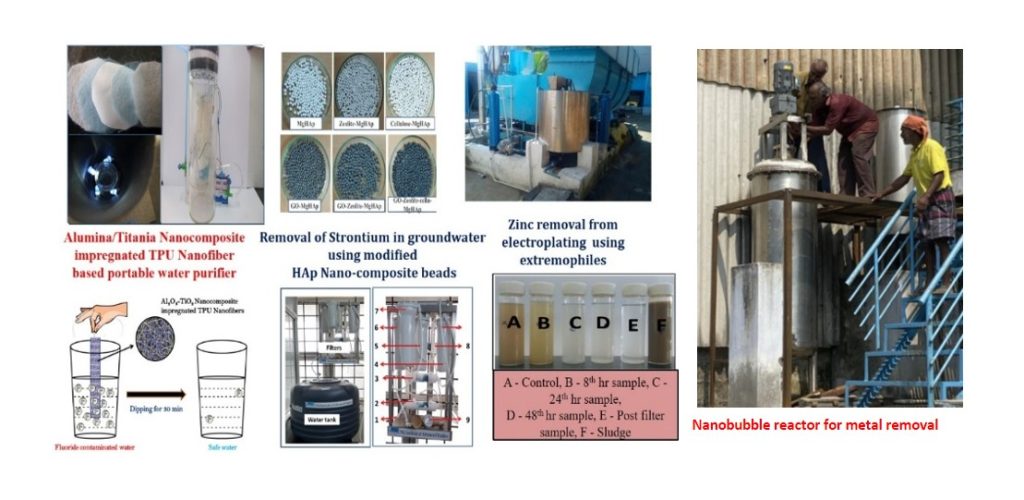 The group focuses on developing an integrated nanotechnology and bio based concepts for treatment of domestic and industrial wastewater and effluents. We have successfully developed 2D electrospun nanofiber membranes impregnated with catalytically active nanomaterials for adsorption of various emerging contaminants, radioactive compounds, and metal/metalloids from wastewater and effluents. Indigenous nanobubble technology foe electroplating effluent treatment has been successfully demonstrated at Industrial Scale. Extremophile microbes capable of surviving extreme conditions have been explored for its ability to sequester contaminants from contaminated water and soil samples in real-time. Use of bacteriophage and carrier development for delivery of these phage’s for mitigation of antimicrobial resistance has been actively pursued.